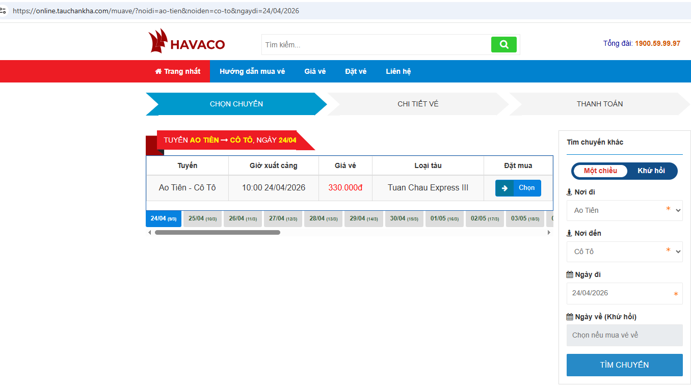 Cách đặt vé tàu Cô Tô (Havaco) trực tuyến