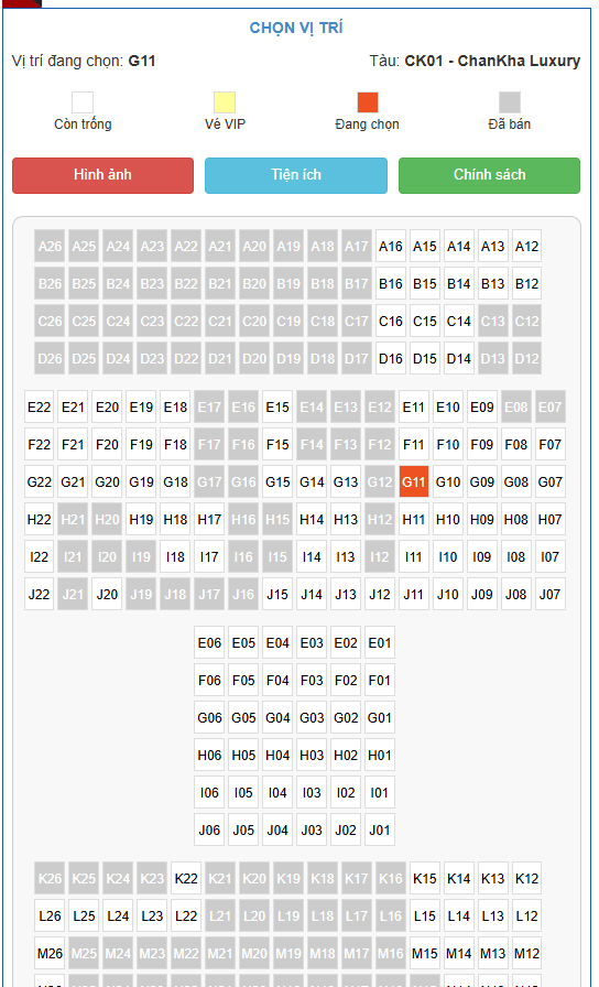 Chọn vị trí trên sơ đồ tàuKhoang VIP hiển thị màu vàng