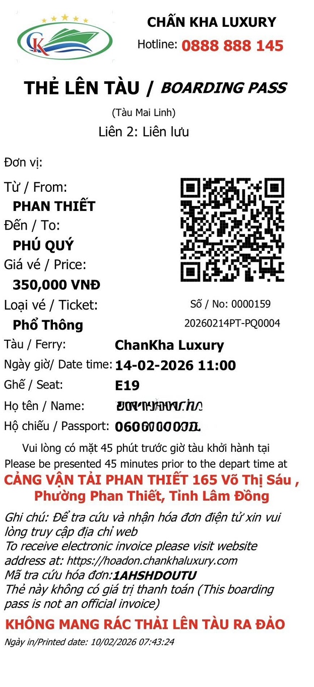Vé tàu Chấn Kha Luxury Phan Thiết - Phú Quý thường hết sớm vào dịp cao điểm, vì vậy hành khách nên chủ động đặt vé trước chuyến đi tại: https://online.tauchankha.com/. Zalo hỗ trợ: 0901442555.